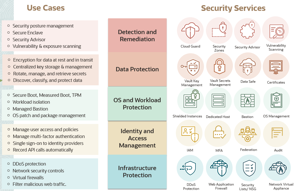 ほとんどのセキュリティサービスは、追加料金なしで組み込まれています。下の図は、OCIがどのようにしてディフェンス・イン・デプス、つまりスタックの複数の層にわたるセキュリティを、さまざまなセキュリティサービスによって実現しているかを示しています。