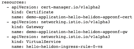 デプロイされたComponentのTraitを開くと、Certificate、Istio Gateway、Istio VirtualServiceも自動的に作成されていることがわかります。