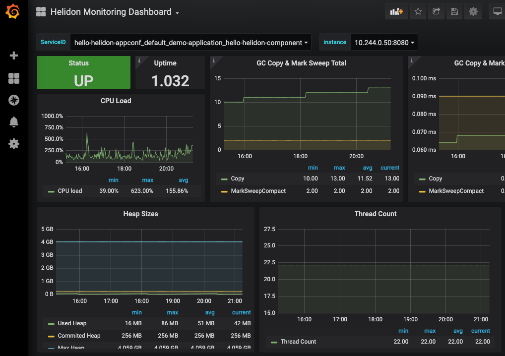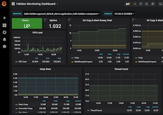 base_REST_request_total{method="getDefaultMessage"}また、Grafanaを開いてHelidon Monitoring Dashboardを選択すると、デプロイされたコンポーネントの詳細情報を確認することが可能です。