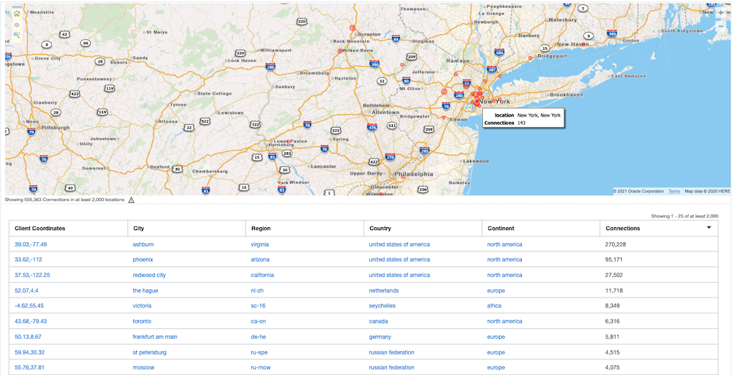 Logging Analyticsを使用する場合、ジオエンリッチメント機能は追加コストなしで利用でき、すぐに使えるすべてのログソースはジオエンリッチメント用にあらかじめ設定されています。ロードバランサー、監査ログ、VCNフローログなどのソースを選択し、ログエクスプローラーのマップ可視化をクリックするだけです。ここでは、お客様がLogging Analyticsを使用して地理的な可視化を行う方法をいくつか紹介します。