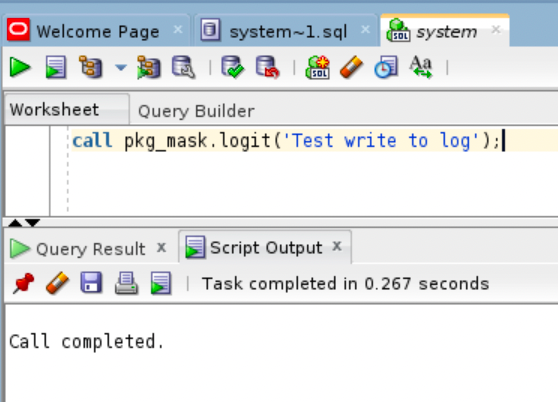 call pkg_mask.logit(‘Test write to log’);手順が正常に終了しました。ログエントリーがあることを確認してみましょう。そのために、ターミナルに戻って見てください。