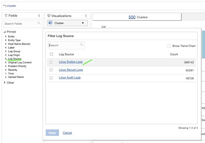 [Logging Analytics]に移動します。[Log Explorer]で[Select visualizations]をクリックし、[Cluster]をクリックします。