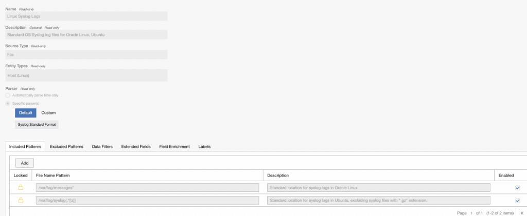 LinuxのSyslogログをさらに詳しく見てみると、ログソースから、どのログが考慮されているか(この場合、/var/log/syslogと/var/logメッセージ)、どのパーサーが使われているか(syslog標準形式)などがわかります。パーサーの詳細と使用されている正規表現(regex)を見ることができます。