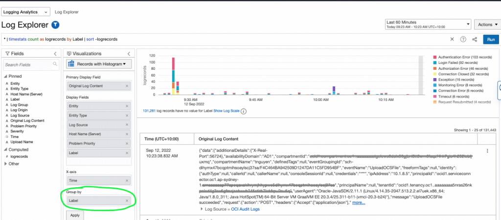 色分けからわかるように、Logging Analyticsはあらかじめ定義されたラベルに基づいて、ログから様々なエラーをすでに判断しています。この機能は、手動でクエリを実行することなく、ログを素早く洞察することができます。