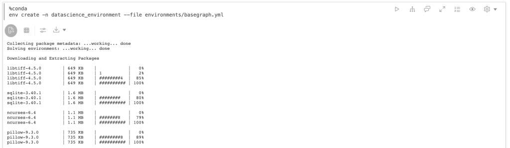 Graph Studioノートブックでは、管理者権限を持つユーザーがGraph Studioセッション内で使用するためにサードパーティのPythonパッケージをconda環境にインストールできるようにするcondaインタプリタが導入されています。環境が作成され、パッケージがインストールされると、管理者ユーザーはconda環境をObject Storageにアップロードできるため、管理者以外のユーザーが簡単にアクセスできます。