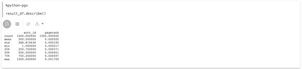 conda環境をアクティブ化すると、ユーザーはノートブック段落でパッケージ機能を起動できます。最初の例では、Python pandasパッケージのdescribe関数を使用して、pandasデータフレームに変換されたPGQL問合せの統計を表示します。2番目の例では、mattplotパッケージを使用して、アカウントID別にPageRank値の棒グラフを作成します。これらの例では、Oracle Graphを利用して、データセットにPageRankアルゴリズムを適用し、グラフから問合せを実行し、サードパーティパッケージを使用してより深いインサイトを取得します。
