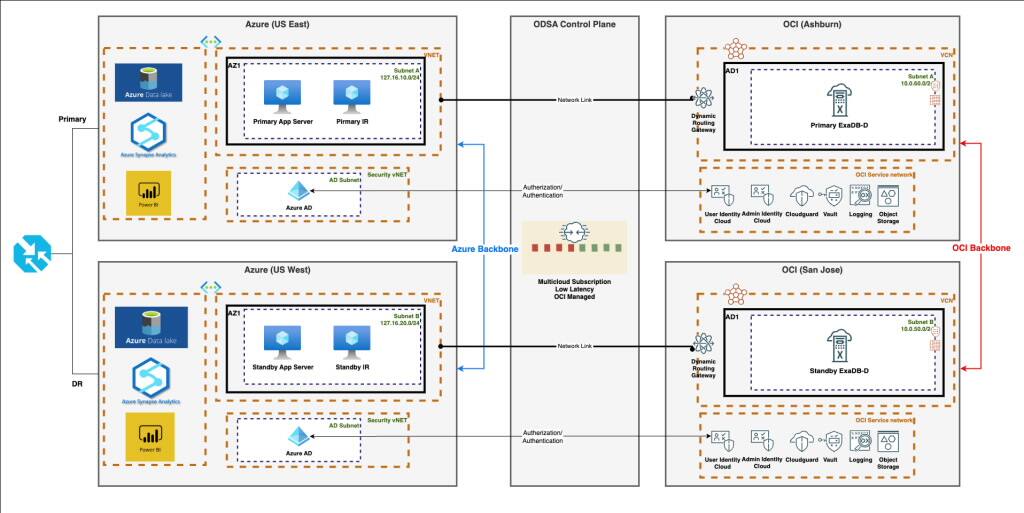 これらの要件は、ODSA機能を適用した災害復旧アーキテクチャを一貫して設計し、災害発生時でも常にアプリケーションスタックとデータベース層の間のレイテンシーを最小にするための容易な道筋を提供することを意図しています。このアーキテクチャは、最も一般的なシナリオに対して効果的なソリューションを提供します。しかし、OCI や Azure Interconnection を採用することで、より明確なアーキテクチャを実現することができます。