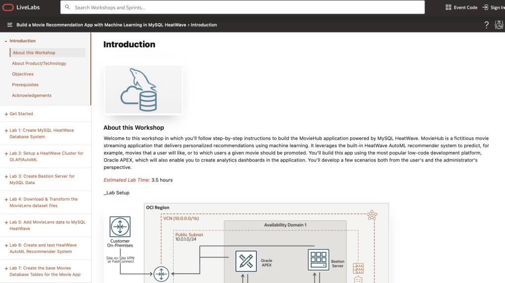 HeatWave AutoML(レコメンダー・システムを含む)は、MySQL HeatWaveのお客様に追加コストなしで利用でき、アプリケーションに簡単に統合できます。実際には、HeatWave AutoMLレコメンダー・システムを紹介するために開発したMovieHubアプリケーションを構築することで、テストできます。このアプリケーションを構築するには、ステップバイステップの手順に従うだけで済みます。最も人気のあるローコード開発プラットフォームであるOracle APEXを使用するため、コードを記述する必要さえありません。