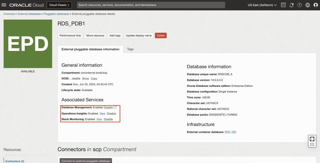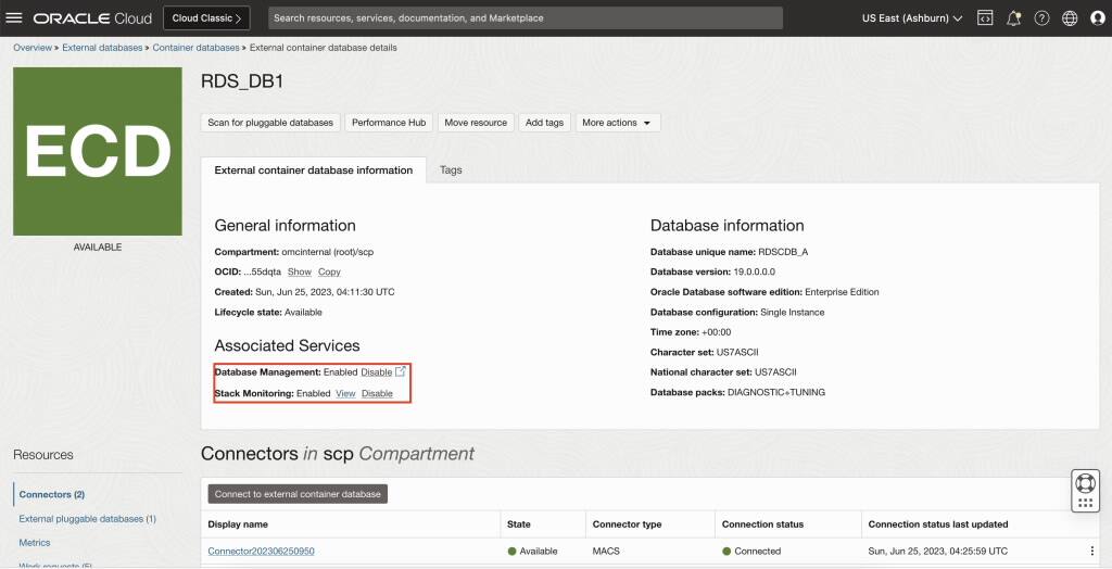 外部データベースに移動し、コンテナ・データベースを選択し、データベース管理、Operations InsightsおよびStack Monitoringサービスの有効化