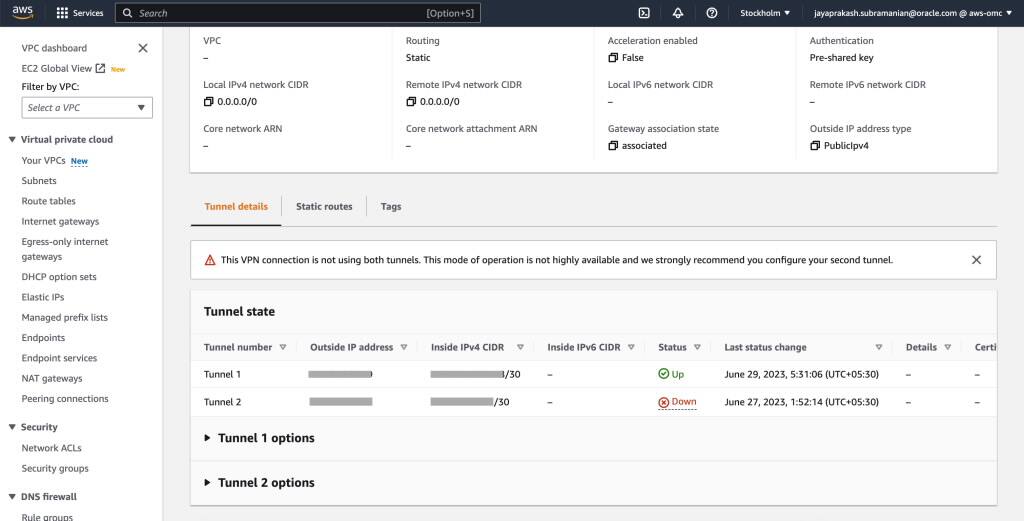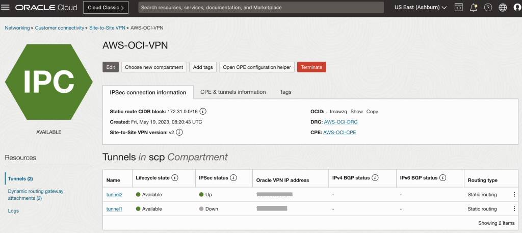 OCIとAWS間の接続を確立するために、複数のオプションを使用できます。静的ルーティングを備えたサイト間VPNを使用して、IPsec VPNトンネルを使用しています。