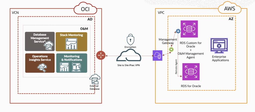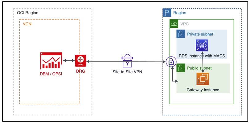 管理ゲートウェイおよび管理エージェントを使用して、OCI O&MでRDSデータベースを検出します。プライベートのみのサブネットにあるRDSカスタムEC2インスタンスにパブリックIPアドレスおよび管理エージェント(MACS)を持つAWS EC2ホストに管理ゲートウェイをインストールします。