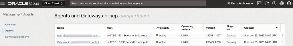 - 「可観測性および管理」の下のOCIコンソールで、管理ゲートウェイおよび管理エージェントのステータスを確認します。