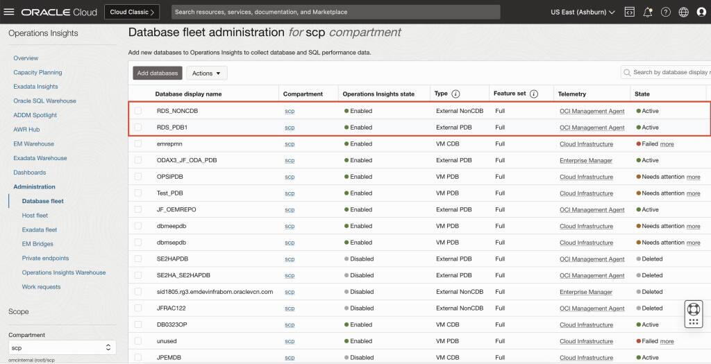 図10: Operations Insights(PDBおよび非CDB)で有効化されたRDSデータベース