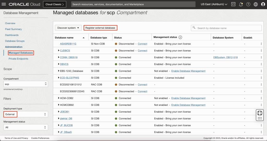 必要なプラグインを有効にしたら、「OCIメニュー」→「データベース管理および管理」に移動します。フィルタでデプロイメント・タイプを「外部」として選択します。「外部データベースの登録」を選択して、RDSデータベースを登録します。データベースを検出するステップは、ドキュメントを参照してください。
