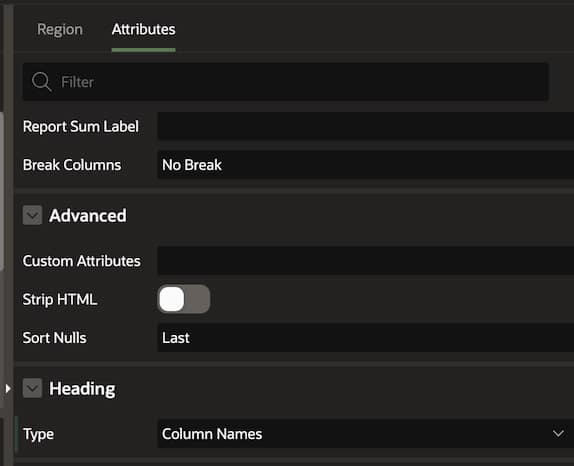 「レポート」リージョンの「属性」タブで、「見出しタイプ」を「列名」に設定します。