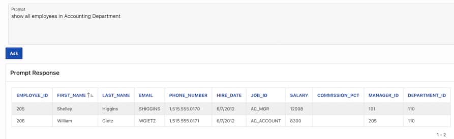 プロンプトを入力すると、Accounting Departmentのすべての従業員が表示され、次のように結果が返されます。