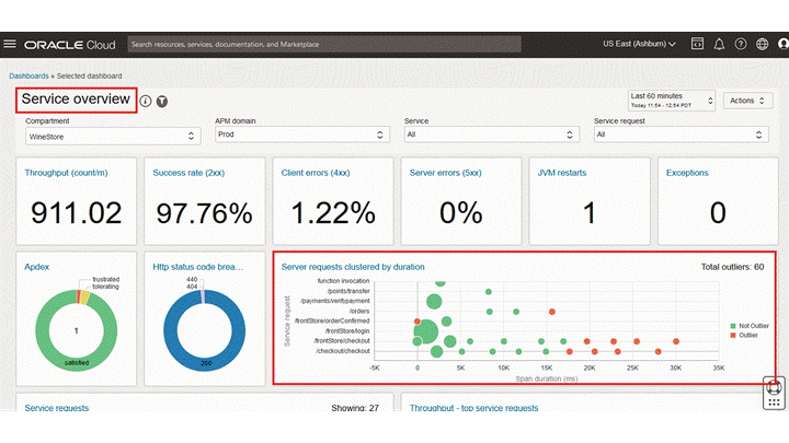- Oracle提供のダッシュボードの「サービス概要」で、期間別にクラスタ化されたサーバー・リクエストを表示します。