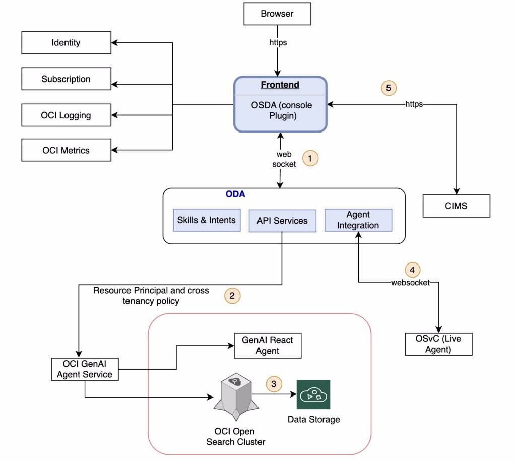 TOSAIチームは、図1に示す高度なアーキテクチャを設計し、GenAIを搭載したOSDAチャットボットをOracle Supportのエコシステムにシームレスに統合しました。このソリューションでは、次の最先端のOracle製品およびテクノロジを使用します。