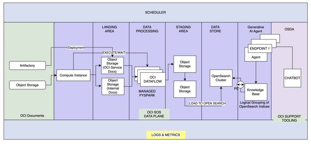 - ドキュメントの取得および処理: Oracle Cloud Infrastructure (OCI)、データベース、Linuxなどのサービス・ドキュメントの最新バージョンを内部リポジトリから取得し、ランディング領域(RAWデータ用のオブジェクト・ストレージ・バケット)に格納します。