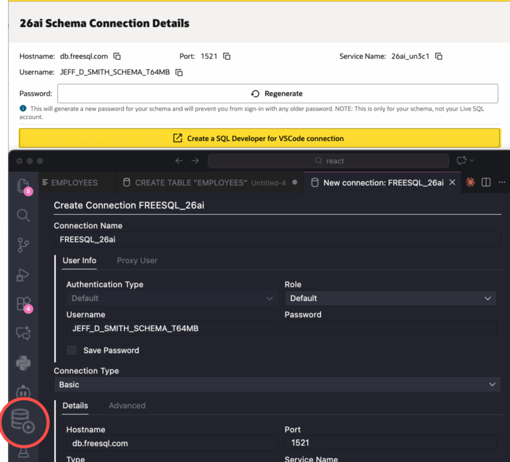FreeSQL.com を使用すると、VS Code 拡張機能を使用して独自の 26ai Oracle データベースに接続できます。