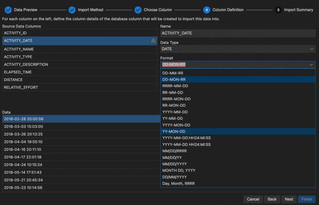 データを正しくマッピングするために追加の情報が必要な列がある場合は、画面に「ペイント」します。最も一般的なケースは、日付またはタイムスタンプを扱う場合です。TO_DATE 呼び出しを適切に構築できるように、形式を指定する必要があります。